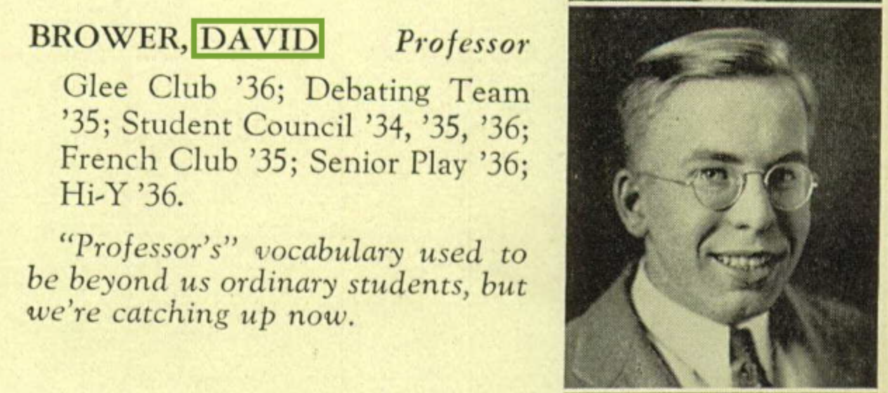 David Farmar Brower died at the age of 90, on January 30, 2009. Mr. Brower was born in Altoona, Pennsylvania, on September 28, 1918. He was the son of Robert Adolph (1884–1937) and Edith Clarissa Aurandt (1886–1958) Brower. Robert worked for the railroad. David's siblings included Frances A., Joy B., Robert E., and Roberta V. (Lamborn).