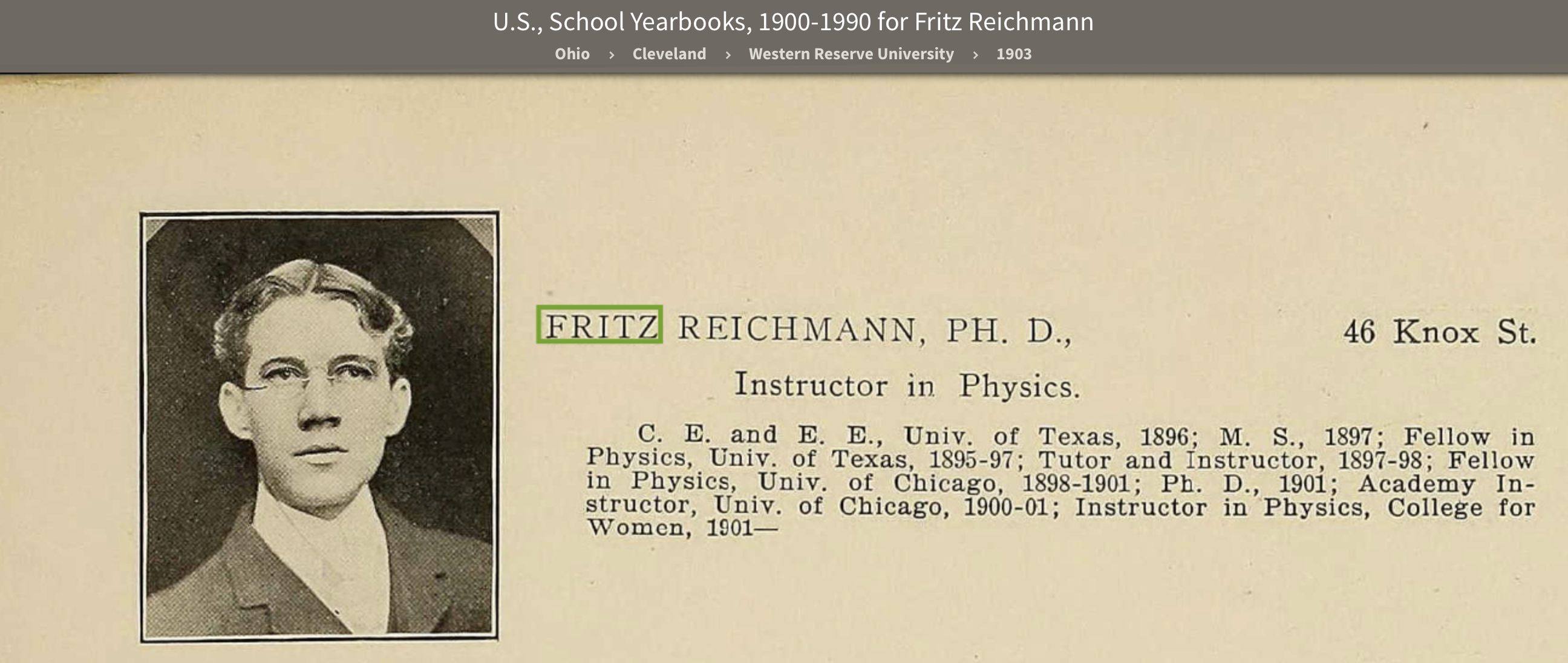 In 1903, the yearbook, Varia Historia, lists Fritz is an instructor at Adelbert College of Western Reserve University in Cleveland. His favorite book is "Peck's Bad Boy."