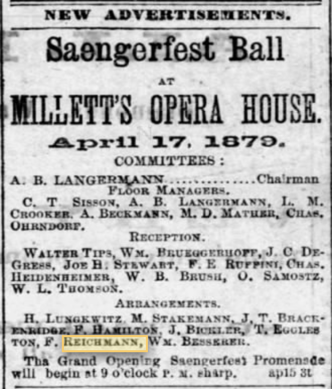 Fritz Reichmann was born December 23, 1875, to Johann Friedrich "Fritz" (1850–1880) and Ellen Marie Adolphine Schumann (1856–1943) Reichmann in in Austin, Texas. Johann, shown at right in a uniform, was born in Kassel, Germany. He had come to New York City in 1866, following his brother, who was in the theater business. He moved to Austin and in an 1872 Austin Directory, he was a clerk with Walter Tips & Co, a hardware merchant at Congress Avenue b Bois d’Arc and Hickory Street. His grandnephew, Phil Sterzing says he was told that Fritz Sr. became the manager of the Millett's Opera House. This ad for the house contains his name.