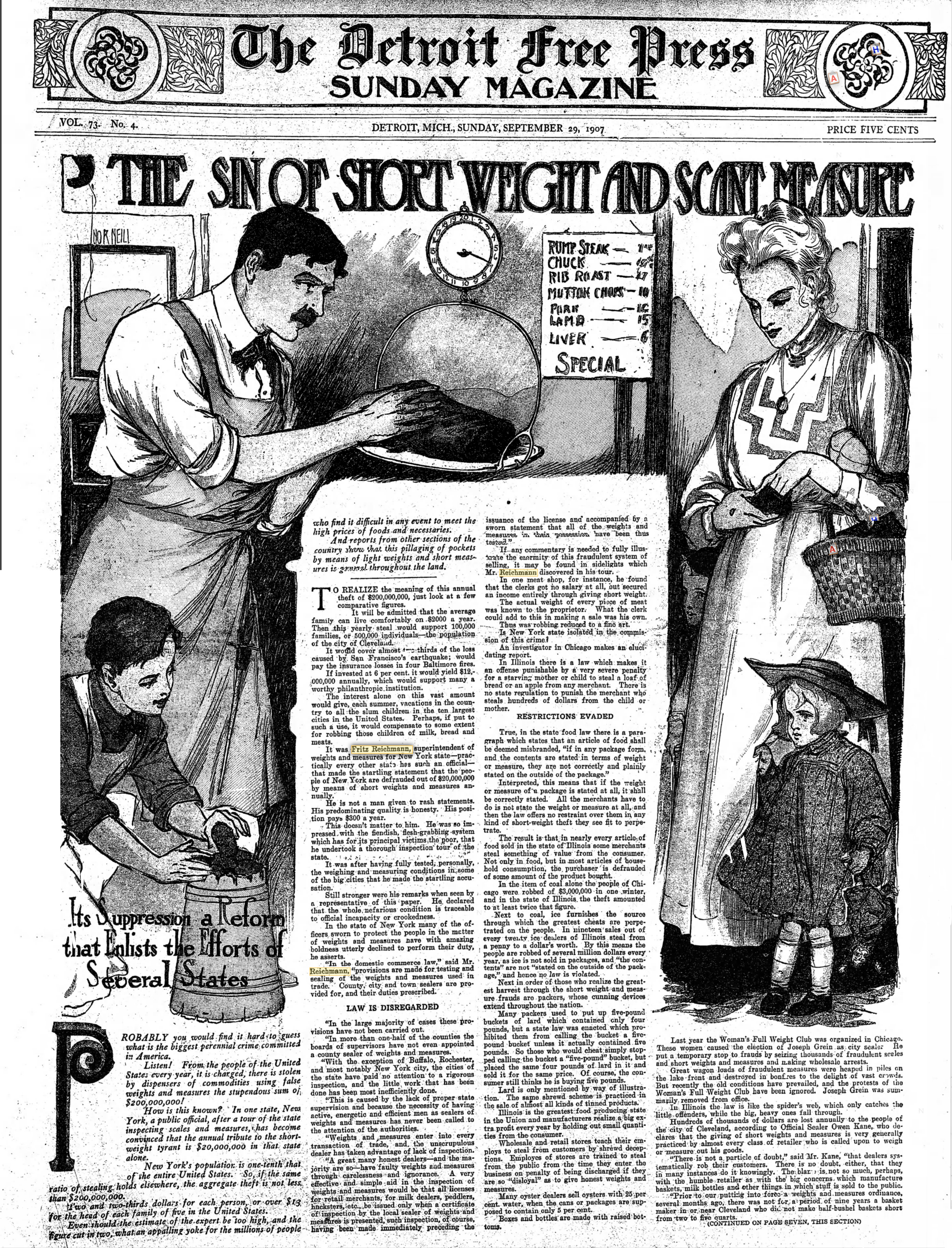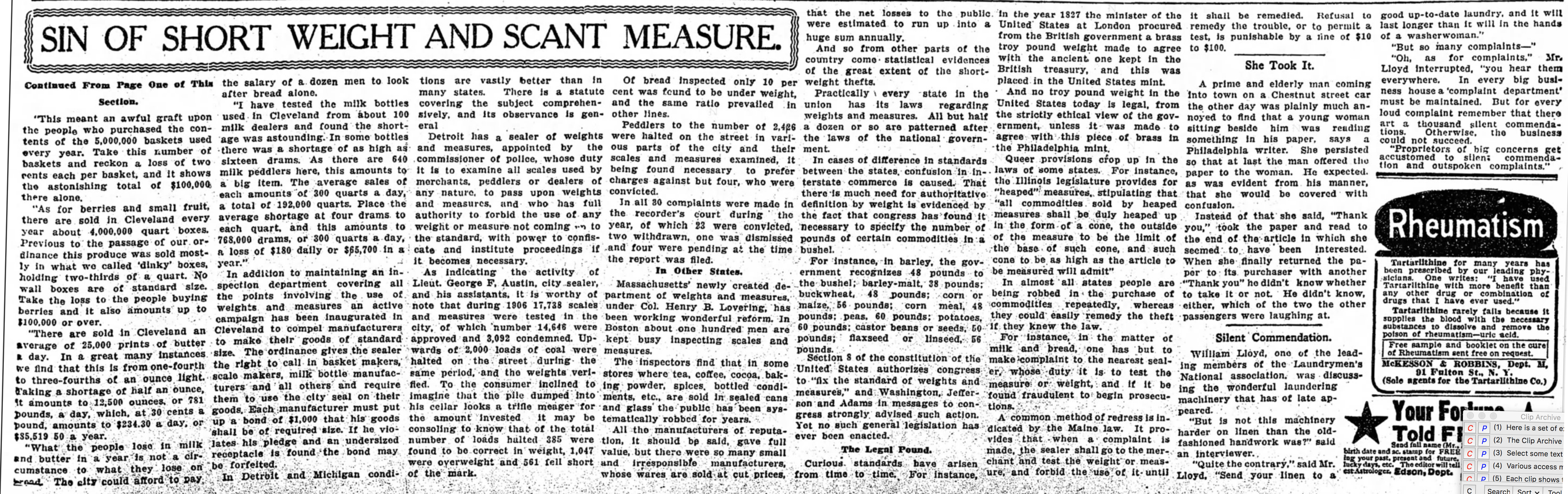 In 1907, the Detroit Free Press rand the following article. Publicity such as this by Fritz Reichmann was responsible for the reform of weights and measures in the country. You will have to zoom your browser to read the text. It is worth doing.