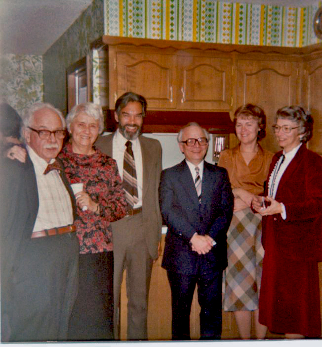 Hans Schlüter visited UT in Feb. 1981. A party in his honor was held at Pat and Mel Oakes' home. L to R: Mel Oakes, Hans Schlüter, Tom Griffy, Penny Griffy, Wilson Nolle, Peggy Nolle, Susan Antoniewiz, Pete Antoniewics. |