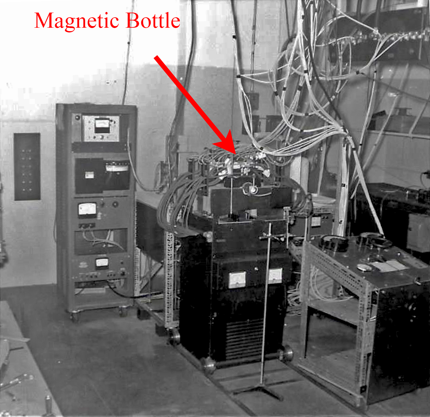At left is the radio frequency (30 Mhz) discharge in a magnetic bottle consisting of two solenoids. A bright light ellipsoidal region with high eletron density, 1013 cm-3, appeared at one of the high field regions of the bottle. This made for a highly desireable light source for studying the collisional "Stark" broadening of the spectral lines of hydrogen and helium. At right is the Bausch and Lomb grating (180,000 lines) stigmatic spectrometer used for these studies. The equipment was used by Schlüter, Carlos Avila and Jim Durham. Avila contributed the photos. More details here.