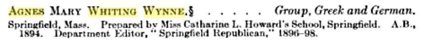 There are but few of kin to Mr. Wynne. His younger brother, Sidney Yale Wynne (1870–1915), died not long since at Redlands, CA., where he was a much-prized physician. There also remains of the family connection Mrs. John Yale of Poughkeepsie, and the only other survivor of all is his wife, who was Agnes Mary Whiting. His remains were taken to the crematory at Springfield.