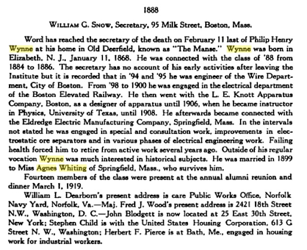 Philip’s mother, Madeline was daughter and granddaughter of Linus Yale Jr. and Linus Yale Sr., both were locksmiths and inventors of the Yale lock. Linus Jr. (shown at right) invented the pin tumbler lock. Philip would have had many opportunities to develop workshop skills early in his life in his father’s shop. His father was also a respected portrait painter. Philip attended the public schools of Shelburne Falls, MA, and the Arms Academy of the same place, from which he was graduated in 1882. The next two years he devoted to a general study of art and allied subjects in Boston. His parents separated around 1875 and his mother changed the spelling of their name to Wynne. In 1884, he entered the Massachusetts Institute of Technology, where he remained for two years. The following year he spent in Chicago as an ironworks chemist for the Union Steel Company. He was next connected with the Thompson·Houston Electric Company (later the General Electric Company) of Boston. Next he served as an electrical engineer of the wire department for the city of Boston, and, still later, for several years, he was electrical engineer for the Boston Elevated Railway; after which he became designing engineer of the L. E. Knott Apparatus Company of Boston. Mr. Wynne was also associated as consulting engineer with several important engineering enterprises, and for brief periods was engaged in newspaper work. In 1899, he was married to Miss Agnes Whiting, of Springfield, MA. Agnes (1870–1928), was a talented young woman who was a violinist, journalist, and crafter. Agnes graduated from Bryn Mawr in 1894 where she studied Greek and German.