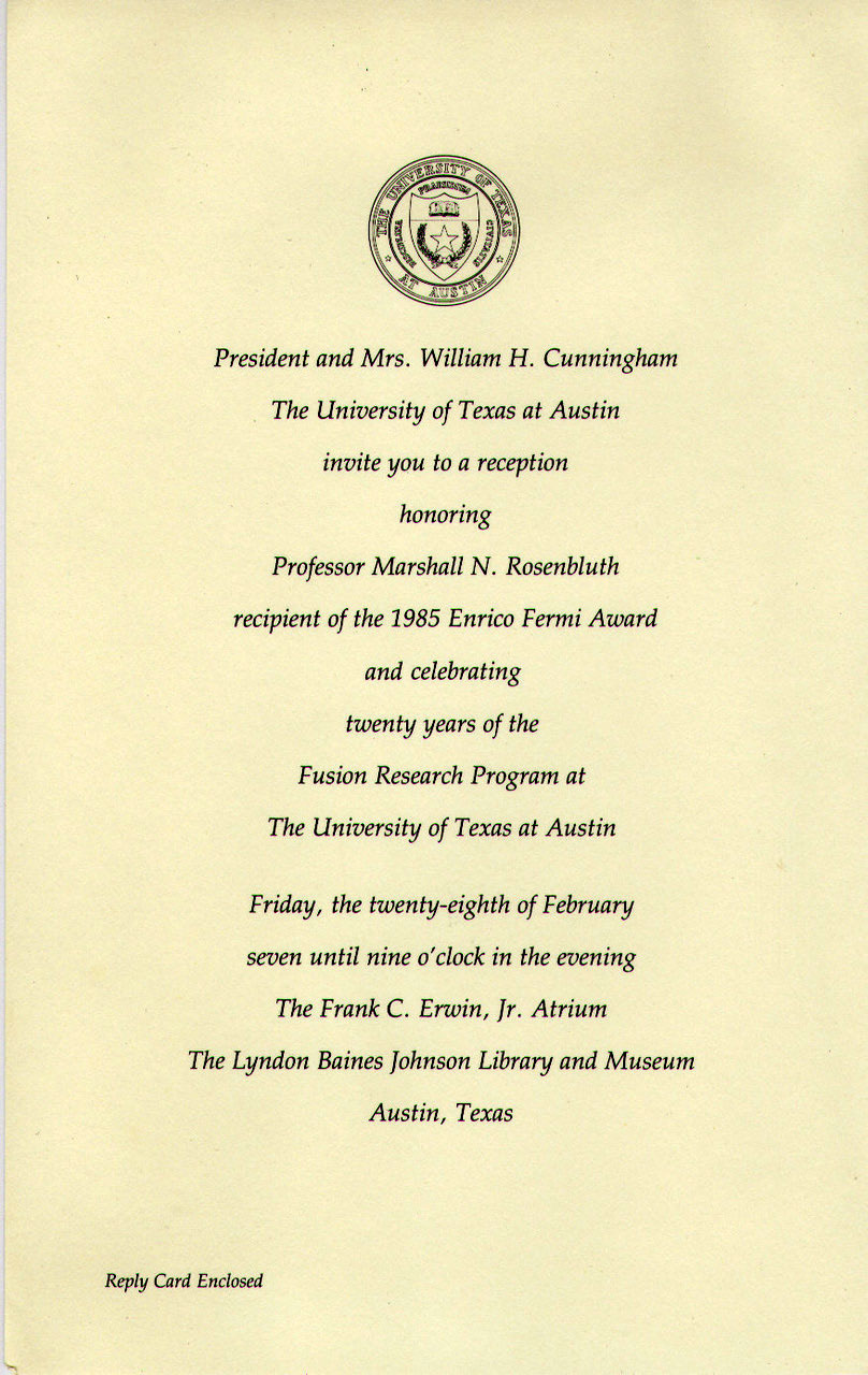 In 1980, Marshall Rosenbluth moved to the University of Texas at Austin, as professor and director of the newly-formed Institute of Fusion Studies (IFS) that was supported by the Department of Energy (DOE) with matching funds from the University of Texas. During the seven years of his tenure at Texas, Rosenbluth led a beehive of scientific activity in many areas of plasma physics that included the understanding of how kinetic theory influences the behavior of magneto-hydrodynamic stability, the development of new concepts in nonlinear dynamics, and the development of new approaches in the description of plasma turbulence and transport. Marshall was appointed to the Fondren Foundation Centennial Chair in Physics in 1983, and he was a recipient of the Enrico Fermi Prize awarded by the Department of Energy in 1985. In 1987, the IFS organized a symposium to celebrate Marshall’s sixtieth birthday. Approximately 150 physicists from many countries (most being past collaborators) attended, and a book of this symposium, From Particles to Plasmas: Lectures Honoring Marshall N. Rosenbluth, edited by James Van Dam, was published. Symposium Photo Click Here.