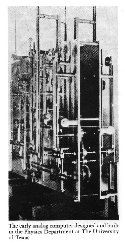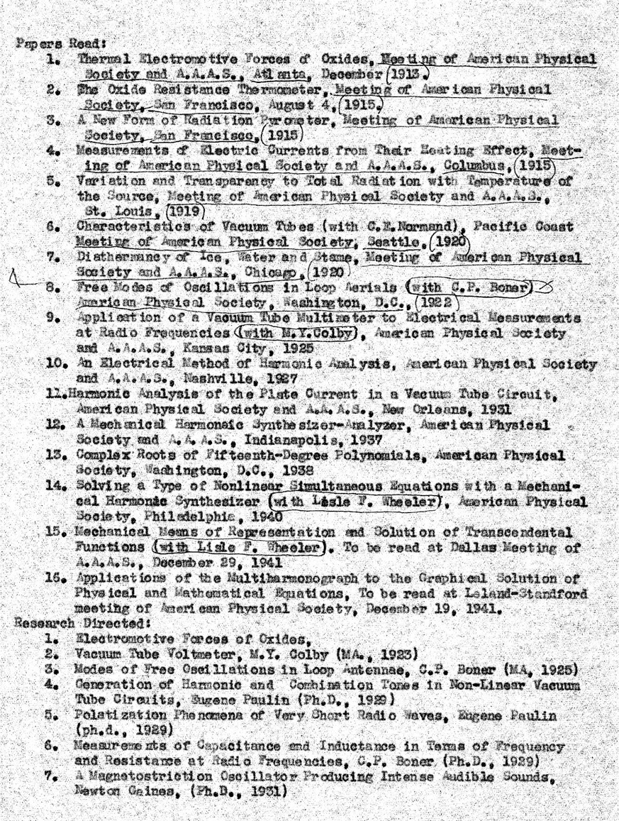 S. Leroy Brown's research was in a number of areas—some of them restricted to problems for which he could find a piece of equipment. If there was no equipment, his paper was only a paper study of the problem. The topics covered included heat transfer, Bernoulli's Principle and the curving of a baseball, new types of resistance thermometers, thermal electromotive forces, radio-frequency electrical measurements, residuals of inductance and capacitance in resistance coils, and other subjects. He conceived and built a complex mechanical harmonic synthesizer analyzer, which was, in many respects, a forerunner of electrical analog computer. Late in 1939, he did extensive work on his multi-harmonograph for solving pairs of non-linear simultaneous equations and transcendental equations, and in doing certain types of network analysis. Brown is shown at right with this device.