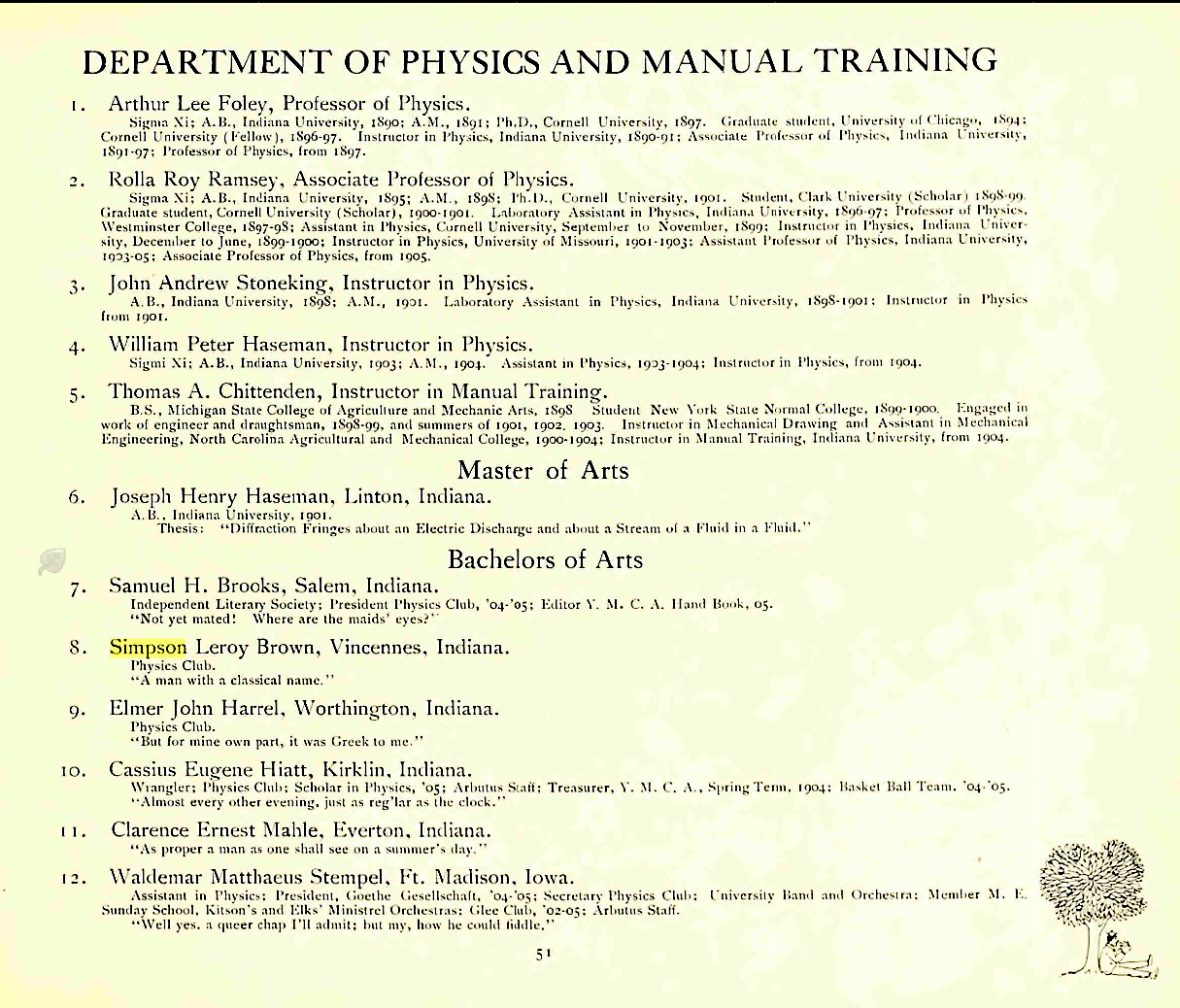 Following graduation from Bloomfield, Indiana High School he received degrees from the University of Indiana—the BA degree in 1905 and the MA degree in 1907. His doctorate was from the University of California in 1909, with major in physics and minor in electrical engineering and mathematics. During the graduate study he was a Whiting Fellow and was an elected member of Tau Beta Pi and Sigma Xi. (Harold Whiting (1855-1895) was youngest member of Harvard Physics Department in1884, was said to have an agility of mind and inventiveness approaching genius. He and his whole family perished in a shipwrecck in 1895. In accord with his Will the Whiting Fellowships were established thave been supporting graduate students ever since. Other UT students receiving this fellowship were Conrad Shuddemagan, S. Leroy Brown, Charles P. Boner.)