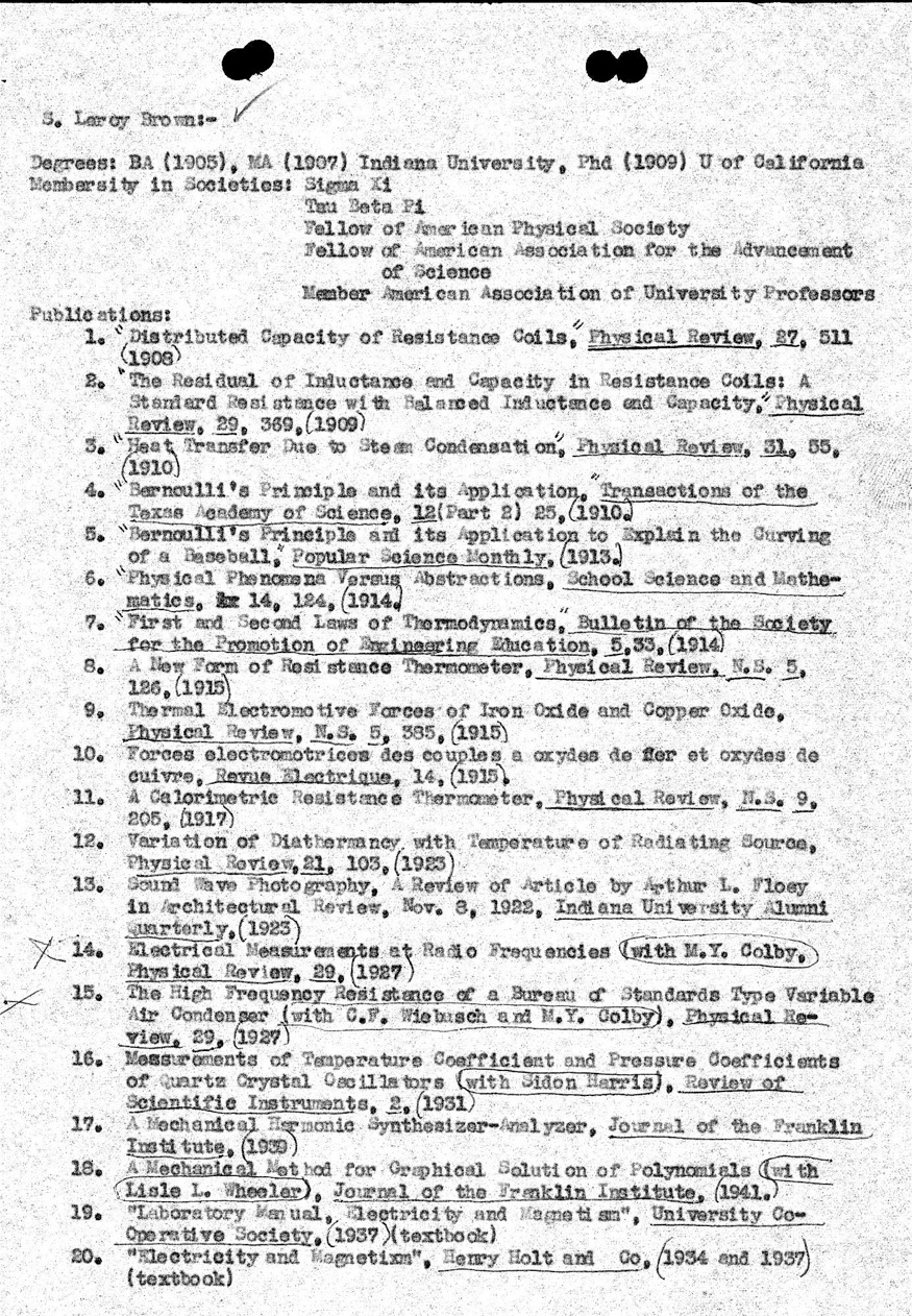 Dr. Brown held student appointments as Assistant Instructor at Purdue University and Instructor at Lehigh University. He came to the University of Texas as Instructor of Physics in 1912 and retired as Professor of Physics in 1954. During World War I, he was President of the Academic Board, Air Service School in Austin, where he succeeded well in setting up emergency training and teaching facilities for radio operators. Later, he was consultant to the War Research Laboratory of the Department of Physics during World War II, and later to its successor, the Military Physics Research Laboratory. He served many years as Chairman of the Department of Physics. Among various organizations he was a Fellow of the American Physical Society and of the American Association for the Advancement of Science. His biography was carried in Who's Who in America and Who's Who In American Education.