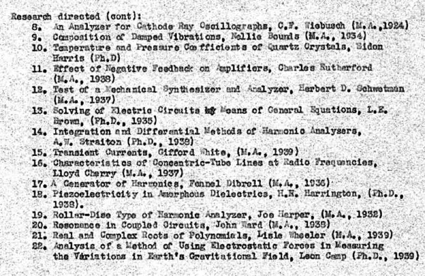 Although the broadcasting venture was short-lived and was soon turned over to the Extension Division, it somehow served to persuade more students to take up advanced physics and to go on to more academic matters. Dr. Brown's days in research were mostly those of no funds (except those slightly diverted from M&E), temporary space under leaky roof and whistling floors, and no equipment except string and sealing wax.