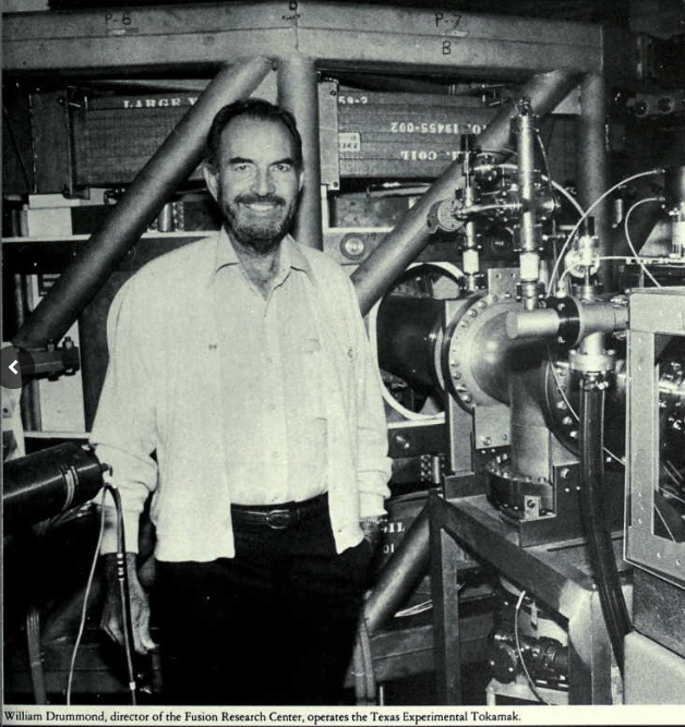 In the early 1960s, Harold P. Hanson, then chair of UT Physics Department, approached Bill Drummond about Hanson’s plan to divert funds to UT that were currently provided General Atomic by a consortium of Texas Power Companies. Bill worked with Hanson to make the proposals to the power companies and to the university administration. By 1964 UT received some seed funds to accomplish the plan and Drummond had moved to Austin and begun recruiting bright young plasma physicists. His efforts ultimately resulted in two of the premier fusion and plasma physics centers in the nation, the Fusion Research Center and the Institute for Fusion Studies. He held the TAEFR Professorship from its establishment in 1983 until he retired.